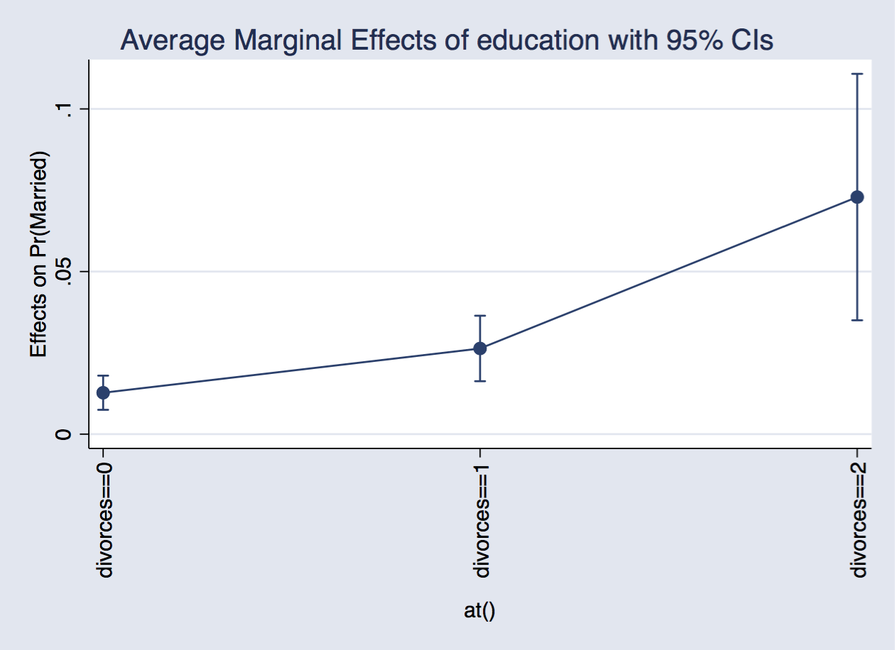 . margins, dydx(education) at(divorces==0) at(divorces==1) at(divorces==2)
